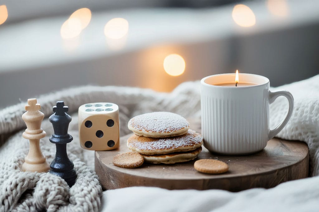 Photo by: Adobe Express / Customized by Green Bee Life Creative Team Cozy game-night vibes with warm snacks, soft lighting, and tabletop classics — a relaxed, welcoming setup that pairs perfectly with a cannabis-friendly Danksgiving gathering.