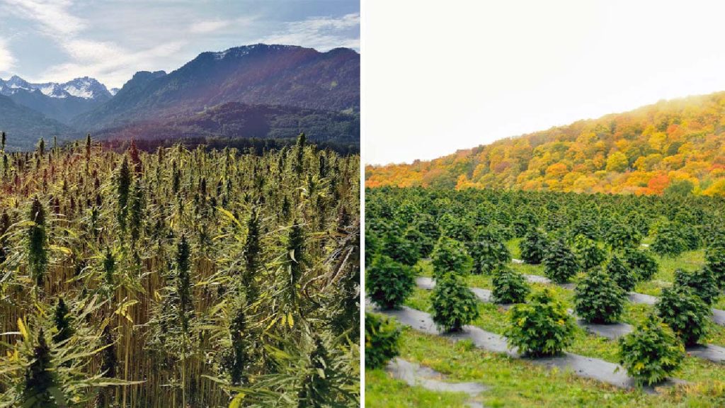While hemp (left side) and marijuana (right side) do look similar, they do have differentiating features in their overall appearance. Hemp grows more tall and slender while marijuana grows to be more bush-like.